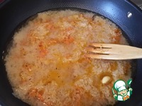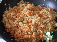 Сверху распределить ровным слоем промытый рис. Залить все холодной водой на 1 см выше поверхности риса (примерно 2 стакана). Готовить при слабом кипении под крышкой около 40 минут. |