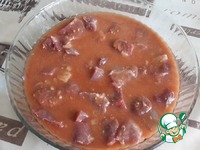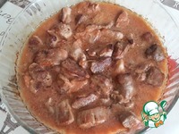 А пока готовится плов, можно приготовить к нему скоромную добавку в виде сочной индейки в томатной подливе. Индейку порезать на небольшие кусочки. У меня филе бедра 2 штуки. |