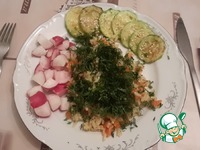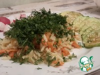 Для себя постный вариант плова я подавала с кусочками жареного кабачка, посыпанными кунжутом, большим количеством свежей зелени (укропа) и редиски. |