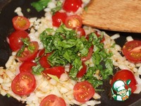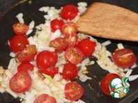 К луку добавить помидоры черри, порезанные пополам. Тушить 3 минуты. |