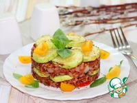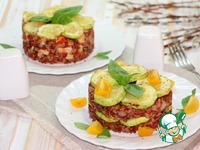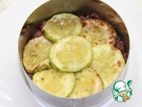 На подогретую тарелку выложить сервировочное кольцо, выложить основу, прикрыть слоем кабачков |