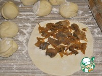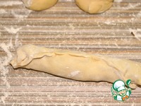 4) Делим тесто на 8 равных частей. Из каждой части раскатываем лепешку. Выкладываем 1/8 части начинки, равномерно распределяем ее. Скручиваем рулет. |