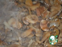 3) Лук (один большой) режем четверть кольцами. Обжариваем на растительном масле до легкой золотистости. Затем добавляем грибы (я не размораживала). Выпариваем всю жидкость. |