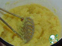 Картофель помять "талкушкой" до состояния пюре. Добавить куркуму (для цвета) и специи. |