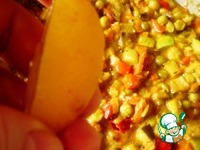 Добавить помидоры в сабджи, перемешать и дать пустить сок. Затем всыпать куркуму, карри и паприку, добавить перец чили, чуть сахару и немного посолить. Добавить горошек с жидкостью, перемешать. |