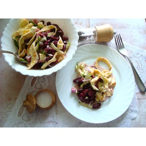 Описание: Салат с консервированной красной фасолью, с ветчиной из индейки и яичным блином, заправленный домашним майонезом, который сделан на жидкости из-под этой фасоли.