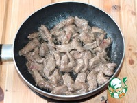 5. Печень промыть, отделить от пленок и прожилок, нарезать небольшими полосками, чем тоньше, меньше, тем будет вкуснее. Выложить печень в миску с мукой и обвалять в муке. Не солить! |