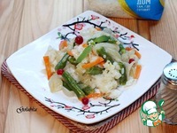 10. Делим постную основу: овощи с рисом на 2 части. Первую часть выкладываем на теплое блюдо, посыпаем зеленью и подаем. |