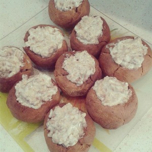 6) И далее с пирожных срезаем верхушку и чайной ложкой вынимаем мякушку. Лучше что бы пирожные еще не остыли, т. е. работать с ними нужно когда они еще горячие.