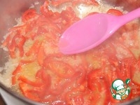 В кастрюле с толстым дном нагреть масло и слегка протушить в нем лук натертый на терке, добавить перец, нарезанный тонкими полосками, тушить 3-4 минуты. |