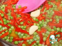 Добавить зеленый горошек и чеснок, тушить 3 минуты. |