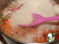 Всыпать рис, перемешать, убрать огонь до минимума и тушить до готовности риса и полного испарения жидкости. |