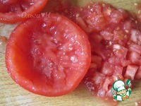 Помидоры разрезать вдоль пополам, аккуратно с помощью ложки вынуть мякоть, нарезать кубиками. |