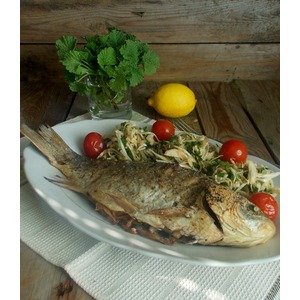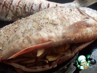 Рыбку хорошо почистить, помыть, сделать надрезики с двух сторон. У меня была с икрой, я ее там и оставила. Рыбу посолить и присыпать лимонным перцем, смазать маслом противень и саму рыбу. |