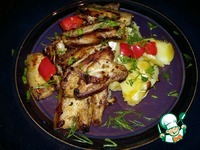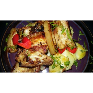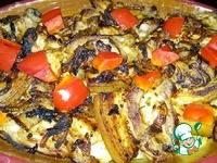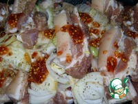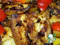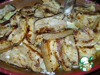 Довести блюдо до готовности в духовке при 180*С. У меня это заняло около 15 минут. За 5 минут до готовности посыпать мясо нарезанной кубиками паприкой. |