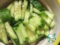 Огурец нарезаем соломкой и добавляем к луку и грибам. |
