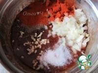 Икру смешать с мелко нарезанным репчатым луком и чесноком, добавить соль, перец, паприку, перемешать. |
