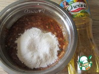 Всыпать муку с содой, влить растительное масло Олейна, перемешать. |