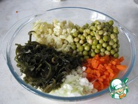 С горошка и морской капусты слить жидкость, добавить к остальным овощам. |