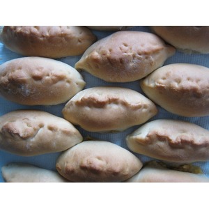 Выпекать при 180С, примерно 30 мин. У меня получилось 2 противня пирожков. |