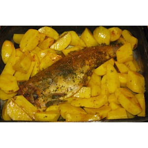Картофель с рыбой уложить в глубокий лоток для запекания, полить маслом со специями из миски с картофелем, запекать при 200С до готовности (примерно 40 мин) |