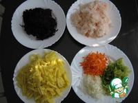 Воду влить в кастрюлю (не меньше, чем на 4 литра), довести до кипения, добавить 3 ст. л. растительного масла, картофель и капусту. Варить до готовности. |