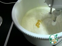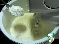 Когда сливки почти взбились, вводим тонкой струйкой охлажденный желатин, не переставая взбивать |