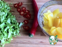 Салатные листья нарезать тонкой соломкой, чили-колечками, персик-тонкими ломтиками. |