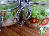 Выложить в баночки слоями рис, салатные листья, колечки чили. |