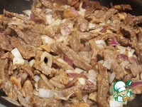 Выложить лук к мясу с грибами. Обжарить, привернуть огонь, накрыть крышкой и тушить около 30 минут. |