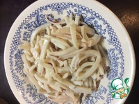 Кальмары очистить, отварить в течение 2 минут в подсоленной воде и нарезать соломкой. |