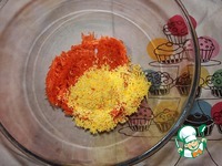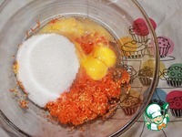 Ставим духовку на разогрев до 180°C. Натираем морковь и цедру апельсина, высыпаем их в одну миску и перемешиваем. |