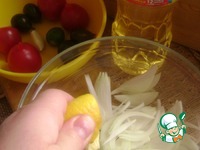 Лук нашинковать тонко –лучше вдоль луковицы. Присыпать сахаром и солью, полить лимонным соком и немножко промять. Оставить мариноваться минут на 10. |