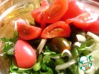 Помидоры черри разрезать пополам. У меня в этот раз двух видов, но на вкус это не влияет. Выложить в салат. Оборвать листья петрушки и крупно их порвать в салат. |