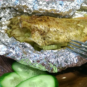 На сложенный вдвое лист фольги уложить рыбку, в брюшко положить сельдерей и коренья, сверху полить оставшимся соусом. Со второй рыбкой поступить так же. |