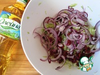 Капусту нарежем соломкой, добавим щепотку соли и перетрём руками до мягкости капусты. Добавим лук, нарезанный полукольцами и вяленую клюкву. |