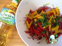 Перец нарежем тонкими полосками, петрушку порубим и добавим в салат. |