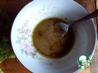 В мисочке смешиваем ингредиенты для заправки: оливковое масло, уксус, лимонный сок, солим и перчим по вкусу. |