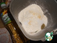 Затем добавить ржаную, пшеничную муку, сахар, соль, чесночный порошок. |
