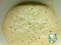Сначала приготовить опару: воду с соком слегка подогреть. Перелить в миску, добавить мед и дрожжи, перемешать до растворения. Добавить просеянную муку, перемешать. Затянуть пленкой и оставить на час. |