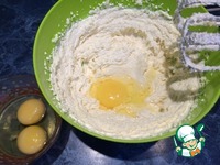 Добавить частями сахар, продолжая взбивание. Затем по одному ввести яйца. |