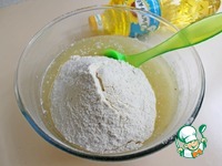 Всыпать разрыхлитель, ванильный сахар и муку (1 ст л муки отложить ). Перемешать все до однородности. |
