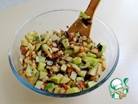 Цуккини или кабачок нарезать на небольшие кубики и обжарить на 1 ст л растительного масла "Олейна" до румяности. Присолить. Выложить в салатник. |