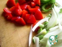 Овощи помыть, нуждающиеся почистить и обсушить. Нарезать перец уголками, лук нашинковать вдоль луковицы, чеснок изрубить. |
