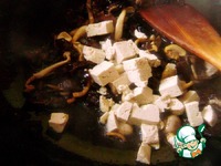 Выложить к грибам тофу и обжарить со всех сторон. |