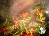 Полить соевым соусом – двумя столовыми ложкам и потушить до его испарения, помешивая. |