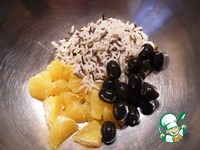 Рис отварить в кипящей подсоленной воде до готовности, воду слить, рис остудить. Из маслин слить жидкость. Апельсины очистить от кожицы и перегородок, нарезать небольшими кубиками. |