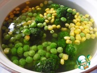 Брокколи разобрать на соцветия, вместе с кукурузой и горошком отварить в кипящей подсоленной воде 3–4 минуты. |