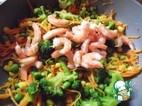 К моркови добавить овощи и креветки, перемешать, тушить 5 минут. |