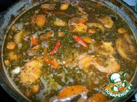 При подаче посыпать зеленью и нарезанным зеленым луком (у меня в этот раз его не было). Не забыть вынуть из кастрюли перец чили, иначе через некоторое время будет слишком остро. |